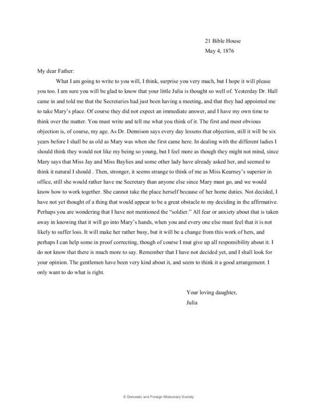 Letter written by Julia Emery to her father regarding her nomination as Secretary of Woman's Auxiliary, 1876.